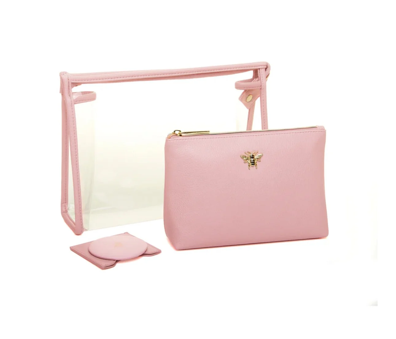 This amazing three-piece set includes a clear PVC makeup and travel case, a luxury textured vegan leather beauty bag, and a beautiful round compact mirror in a matching vegan leather pouch. This set is perfect for all beauty lovers who want to keep their makeup and travel essentials organised and stylish. Whether you want to gift it to someone special or treat yourself, this set will meet all your beauty and travel needs.