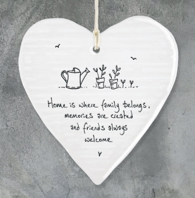 Gifts › Porcelain Wobbly Hanging Heart - Home Image 1 of 1 Porcelain Wobbly Hanging Heart - Home £6.99 Home is where family belongs, memories are created and friends always welcomeSize - 8.5x9.5cm Add To Cart Added! Home is where family belongs, memories are created and friends always welcomeSize - 8.5x9.5cm