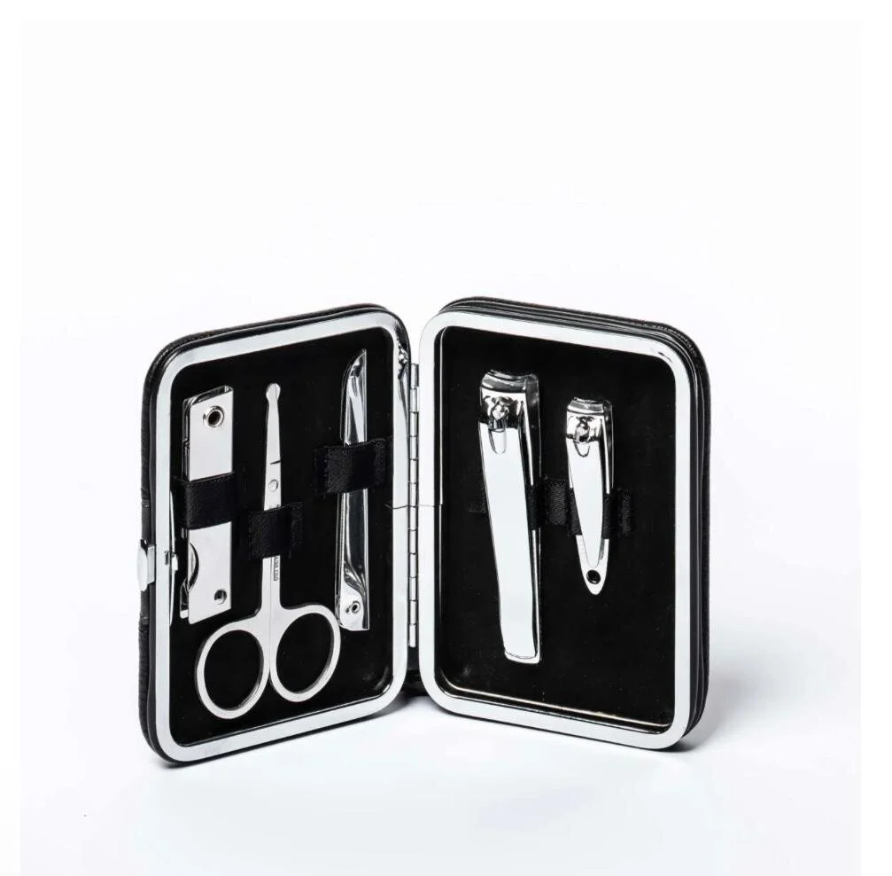Mens 5pc manicure set with graphite band design. Set features a solid black faux leather case with stainless steel implements of scissors, toe nail clippers, nail clippers & multi tool.